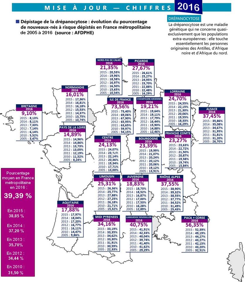 De la même façon, si en 2010 sur la France métropolitaine, 31% des bébés " à risques " se révélaient porteurs de la drépanocytose, ils sont en 2016, 39,39%