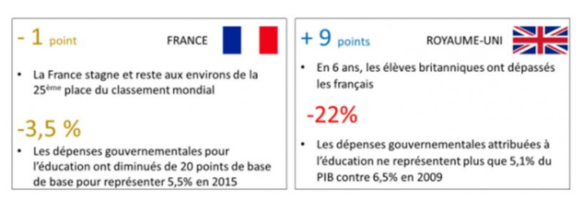 Ceci dans le but de privilégier un domaine clé. Pourtant, en matière d’éducation il n’y a pas de lien majeur entre dépenses publiques et réussite scolaire, comme le montrent les études PISA réalisée dans 75 pays et auprès de 540 000 élèves. Qu’il semble difficile de changer les vieux réflexes français !