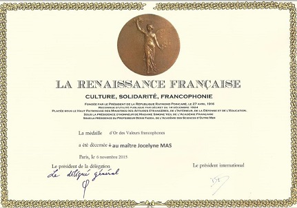 Je tenais à vous informer personnellement du grand honneur qui m’est fait. Je viens d’être promue au titre de "Maître en Littérature" à la prestigieuse Institution de "La Renaissance Française" avec attribution de la Médaille d’Or des Valeurs Francophones, pour l’ensemble de mon œuvre littéraire.