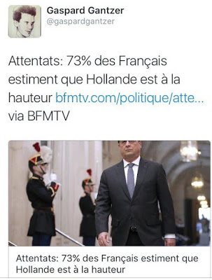 Alors que la police donne l’assaut aux terroristes à Saint-Denis, ville quasi bouclée - je le sais, j’en reviens -, que des policiers sont blessés, que des civils sont tués par des balles perdues, voilà ce que Gaspard Gantzer, le conseiller en communication de Président, se permet de twitter à 06h48 :
