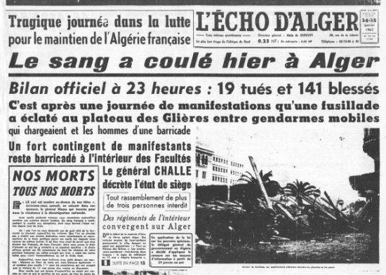 Le gouvernement gaulliste de l’époque ordonne au Colonel DEBROSSE et à ses 17 escadrons de gendarmes mobiles, de disperser sans quartier la foule des Algérois venus manifester contre sa nouvelle politique d’abandon et la mise à l’écart du Général Massu.