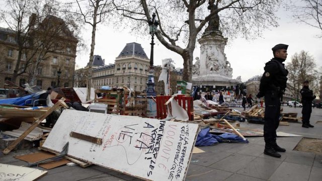" Plusieurs nuits de suite, la place de la République et ses environs ont subi plusieurs dégradations : les murs ont été recouverts de jets de peinture, de tags, des devantures de magasins et des vitres ont été brisées, des poubelles incendiées. Des détritus et déchets s’amoncellent chaque soir et nécessitent chaque matin l’intervention onéreuse des services de la voirie. Au même moment, l’agence de la Société Générale a également été vandalisée à coup de peinture rouge et de graffitis.