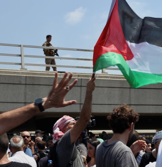 Des manifestants avec un drapeau palestinien, un soldat en arrière-plan