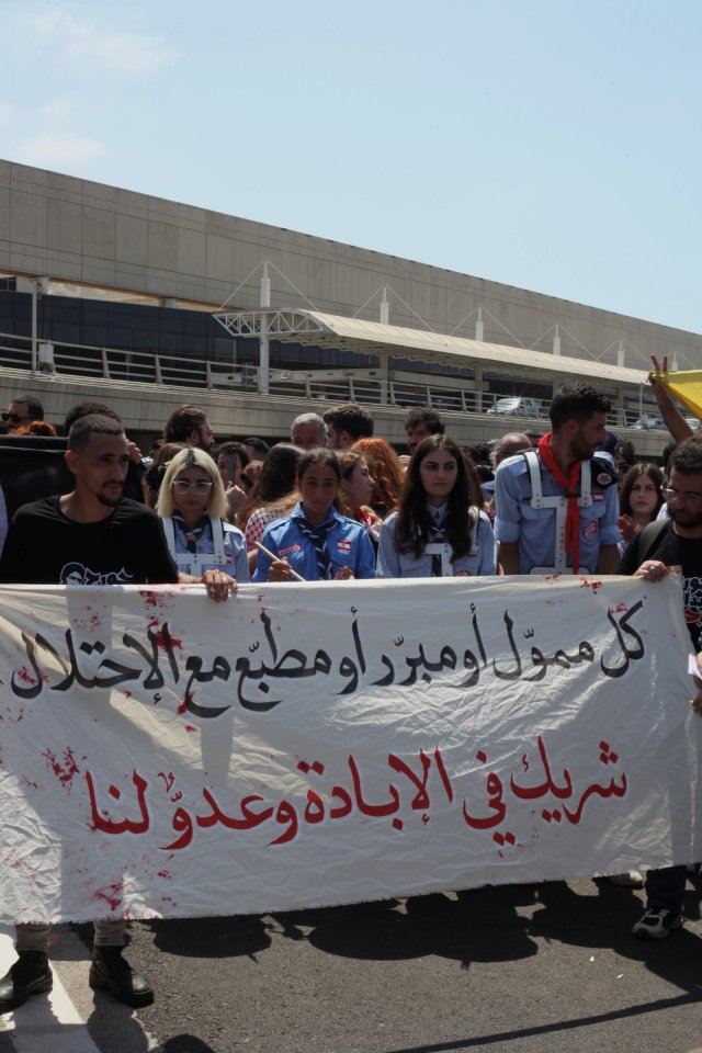 De nombreuses organisations sont présentes, y compris les scouts de l’Union de la jeunesse démocratique libanaise. Sur la banderole est écrit « Quiconque finance, justifie ou normalise les relations avec l’occupation est un partenaire du génocide et un ennemi pour nous. »