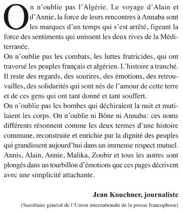 Un petit livre bouleversant ! Annie Séquier-Blanc n’est pas née en Algérie ; elle s’y est rendue pour la première fois en 2005. Pourtant elle a su rendre avec une grande justesse, dans un style sobre, volontairement dépouillé, les émotions qu’a pu ressentir un enfant de cette terre revenu à Bône/Annaba quarante-cinq ans après l’avoir quittée.