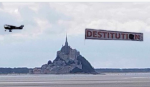 Une banderole hostile à Emmanuel Macron et réclamant sa « destitution » tractée dans le ciel. Le mouvement « Pour La Destitution » lancé dans toute la France pour mettre fin à la « tyrannie »