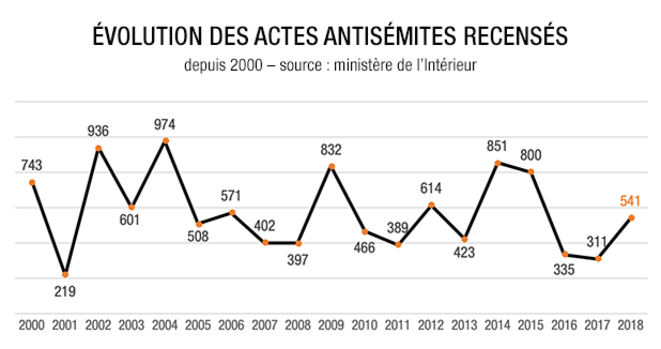 Clair qu’il est plus facile et électoralement plus rentable, même si c’est débile, de dire non à Marine ou Zemmour que de dire non aux muzz antisémites (pléonasme). Le 2 poids 2 mesures, l’indignation sélective, la manipulation, comme d’habitude. Faudrait pas non plus qu’on est l’impression que notre police ne connaît pas les coupables, elle les connaît mais chut, haro sur Zemmour, haro sur les gilets jaunes, haro sur la bête immonde qui ne demanderait qu’à rouvrir les camps mais pas haro sur les muzz ! C’est ainsi. Castaner est capable de nous dire qu’il y a eu précisément 541 actes antisémites en 2018 dont 1/3 d’agressions physiques ou verbales. Si il y a agressions, il y a victimes et celles-ci sont bien capables, j’imagine, de nous dire par qui elles ont été agressées. Levons donc toutes ambiguïtés et donnons, sinon les noms, l’appartenance ethnique ou religieuses des coupables. Ah oui mais les statistiques ethniques et religieuses, faut pas, verboten. Un peu facile et trop pratique à nouveau.