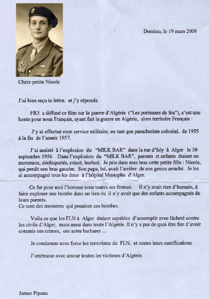 Peut-être ne connaissez vous pas Monsieur James Pipeau qui vient de décéder, laissant sa famille et ses amis dans la tristesse. Une petite fille aussi, Nicole Guiraud, que ce jeune Parachutiste, a relevé blessée, ainsi que son père, dans ce que le FLN considère comme un haut fait d’armes, ayant porté à des hautes fonctions, les porteuses de bombe, terroristes, assassins et tueuses d’enfants Djamilah Bouhired et sa complice de lâcheté Zohra Driff.