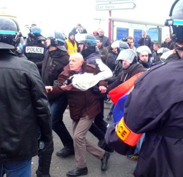 Cette photo a quelque chose de choquant, enfin vous, je ne sais pas, mais moi, elle me choque. Elle a été prise en fin de matinée. Voyez le monsieur plutôt âgé, au milieu, ceinturé par les CRS avant d’être conduit au panier à salades. Ce monsieur n’est autre que le Général de Corps d’Armée (4 étoiles, 2S), Christian Piquemal, ancien patron de la Légion Étrangère, commandeur dans l’Ordre National du Mérite et officier de la Légion d’Honneur.