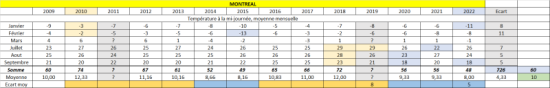 Et ces données confirment bien le phénomène d’îlot de chaleur urbain sur l’île de Montréal. Systématiquement, les hivers sont plus froids à Tadoussac, dans une fourchette entre -6 et -14 pour -3 à -11 pour Montréal en janvier par exemple. De même en été, il fait toujours plus chaud à Montréal. Exemple de juillet avec Montréal entre 22 et 29 et Tadoussac entre 18 et 25. Les villes environnantes de Montréal se situant entre Montréal et Tadoussac. Le phénomène d’îlot urbain se confirme bien en hiver comme en été. Quatrième doute.