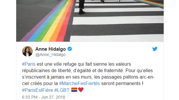 " En plus des « nombreuses actions que nous conduisons avec les associations, je prends aujourd’hui une décision symbolique : nous allons rendre permanents les passages piétons arc-en-ciel que nous avons installés dans le Marais », a ajouté la maire pointant un « signal résolument positif et bienveillant » et un « message de bienvenue » pour les visiteurs du quartier.Plusieurs carrefours du quartier du Marais, où sont concentrés la majorité des bars et boîtes de nuit gays de Paris, avaient été ornés de ces passages piétons temporaires avant la « Gay Pride ». L’un d’entre eux avait été dégradé et recouvert d’insultes homophobes en début de semaine.Anne Hidalgo avait annoncé avoir saisi le procureur de la République de Paris et les inscriptions avaient été effacées. En réponse aux dégradations, la maire de Paris a annoncé mercredi sa décision d’en créer deux supplémentaires, toujours dans le même quartier, et qui seront installés dans la nuit de jeudi à vendredi." (Source Le Parisien)