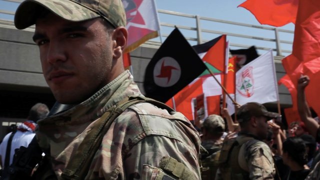 Dans cette foule, le mélange est omniprésent, entre générations — y compris des enfants — mais aussi entre représentations politiques. Les drapeaux du parti communiste libanais — les plus nombreux — côtoient ceux du Parti social nationaliste syrien, du Front populaire de libération de la Palestine, de l’Union de la jeunesse démocratique libanaise (notamment ses scouts) et du Hezbollah. De nombreux portraits et des bannières à l’effigie du prisonnier, peints ou photographiés, sont soulevés et dévoilés fièrement. Sans surprise, des drapeaux de la Palestine s’agitent au vent, comme nombre de keffiehs, là encore arborés par tous les âges. On notera un portrait de Hassan Nasrallah et quelques paroles à la mémoire du Sayed. Tout compte fait, l’énergie de ce rassemblement renvoie à une métaphore joyeuse de la diversité du pays du cèdre.