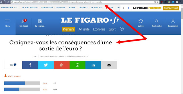La question initiale, comme on peut le voir dans l’adresse internet de l’article en question sur la capture d’écran ci-dessus ou sur le site du Figaro, était : " Etes-vous favorable à la sortie de l’euro ? " et les internautes votent massivement, 75 779 participants. Résultat : 59% répondent " oui ", ils sont favorables à une sortie de l’euro ; un choc à la rédaction ! Quand seulement 41% déclarent ne pasy être favorables. Des résultats pas vraiment conformes à la tendance du Figaro. Rendez-vous compte, à un mois de l’élection présidentielle, près de 60% des internautes et donc, en quelque sorte, 60% des Français abondent dans le sens de MLP ou de Mélenchon, voilà qui fait désordre !
